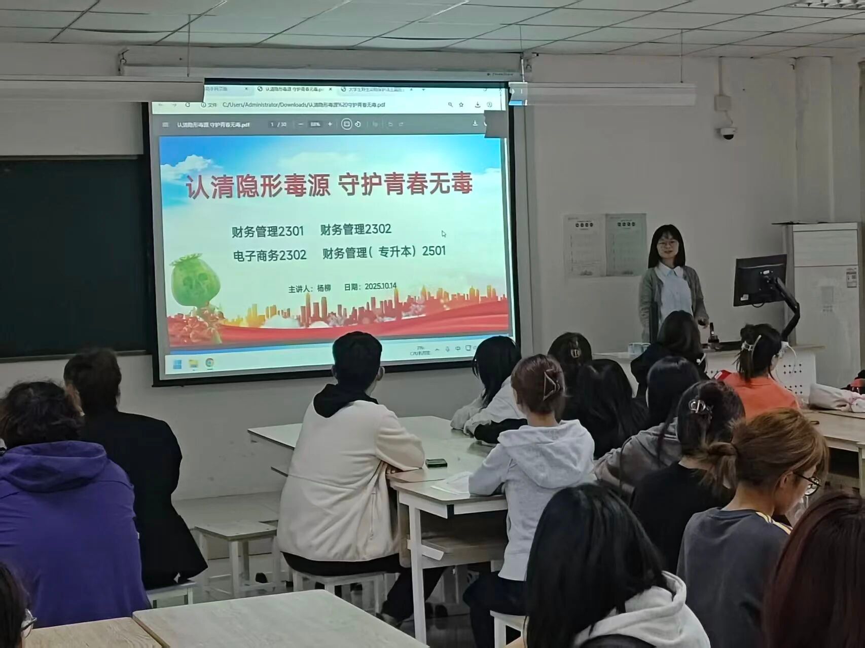 辅导员杨柳、雪菲两位老师以线上线下相结合的教育方式,组织财务管理23级全体学生、电子商务和大数据与会计23级4个校外实习的毕业班学生,开展了识毒防毒宣传教育主题班会活动。两位老师通过播放禁毒宣传片、展示真实案例等形式,直观揭示了各类毒品的巨大危害性,使同学们深刻认识到毒品对个人身心健康、家庭幸福和社会稳定的严重破坏。杨柳老师