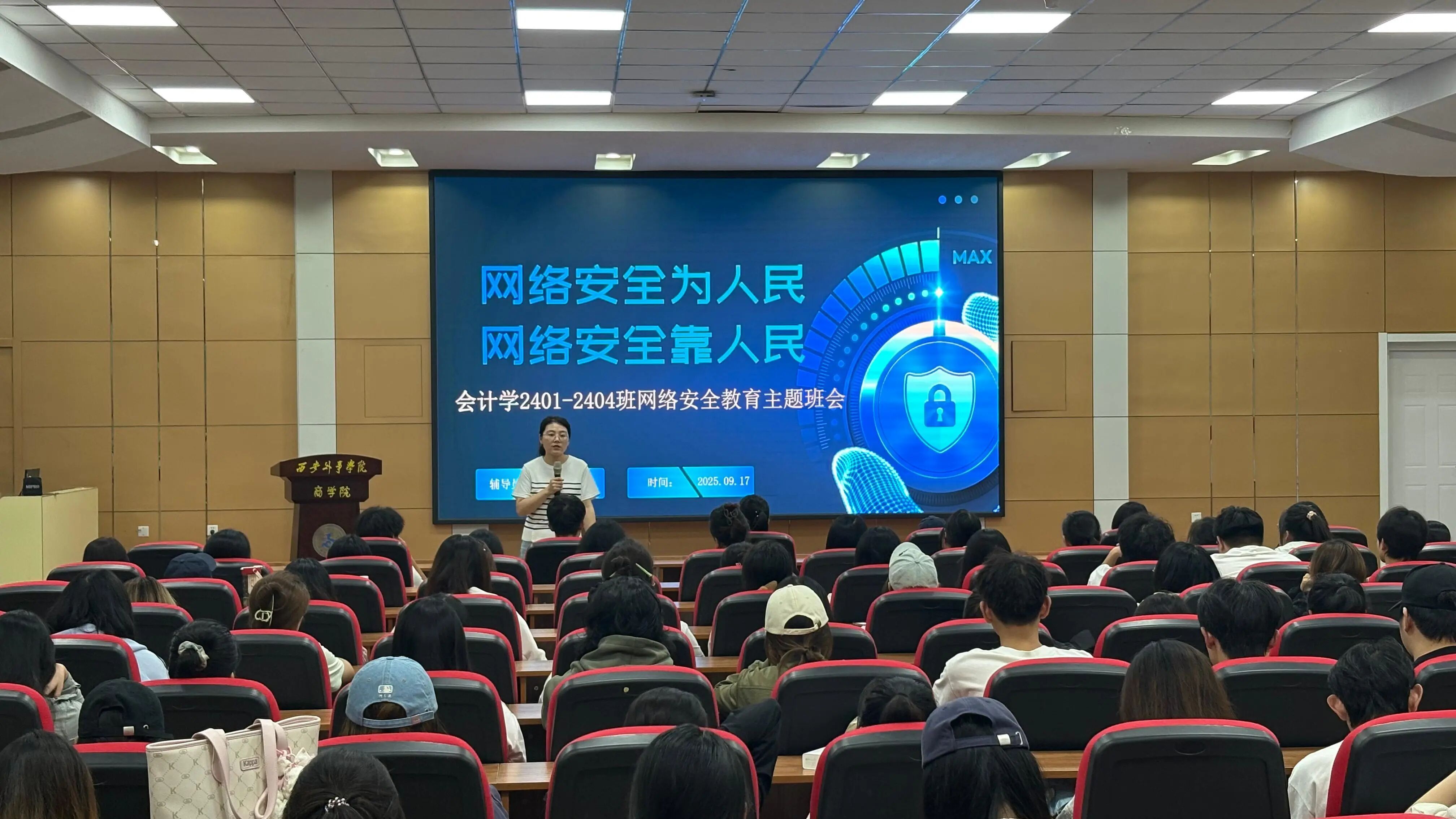 在数字化浪潮与信息全球化的大背景下,网络已深度融入生活,但网络诈骗、信息泄露等安全风险频发,网络空间成为国家安全重要阵地。恰逢国家网络安全宣传周,为提升学生网络安全意识,9月17日李静琦老师在商学院407教室对会计学2405-2408班全体同学开展国家网络安全主题班会。