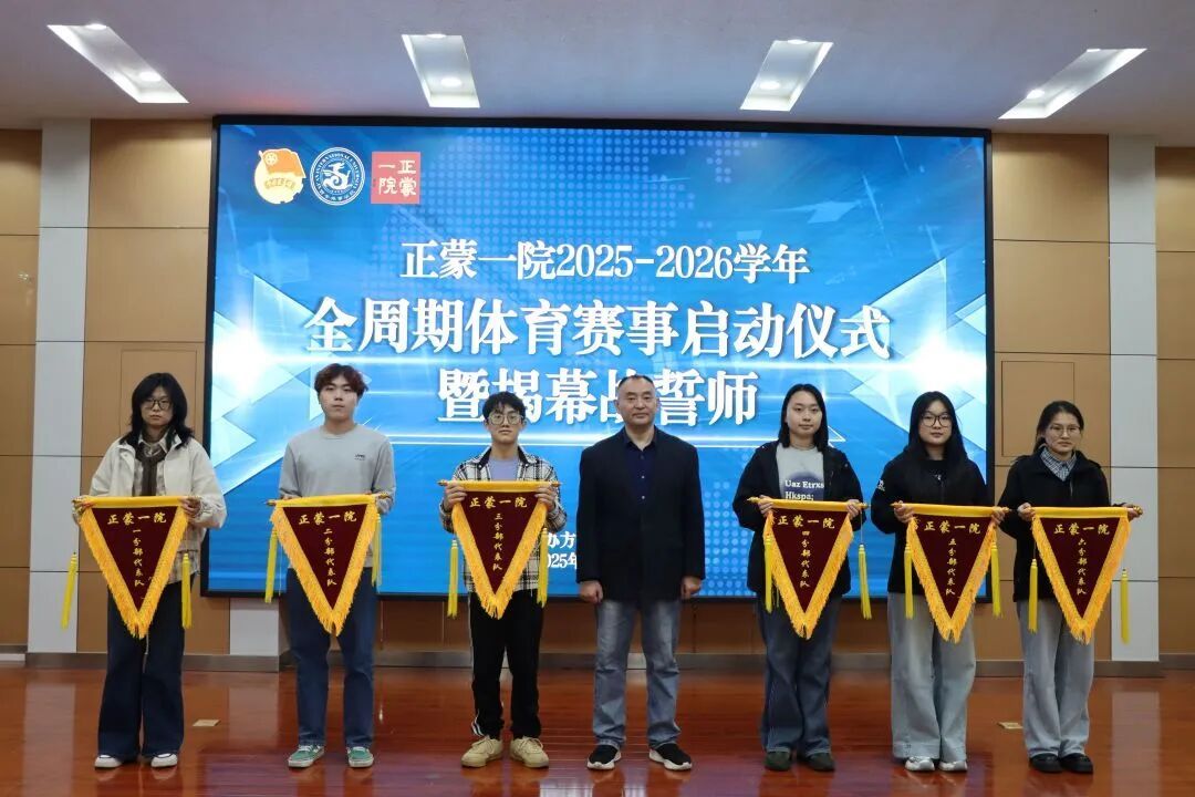 接下来,各位领导老师与运动员代表共同上台,宣布正蒙一院全周期体育赛事启动仪式正式开始。随后,杨睿院长为各楼运动员代表进行授旗仪式。