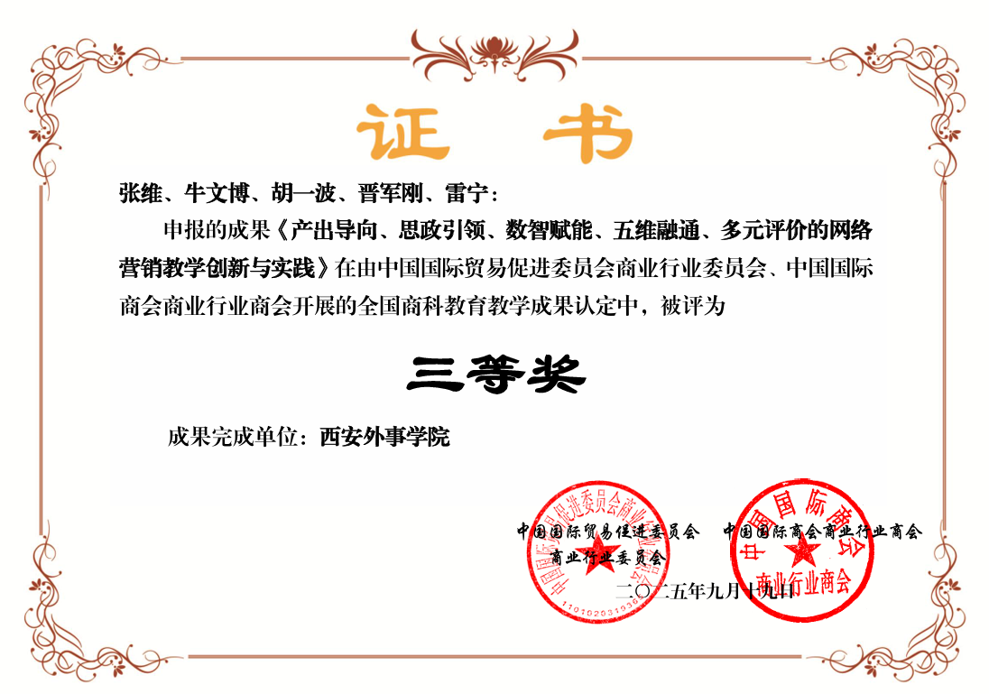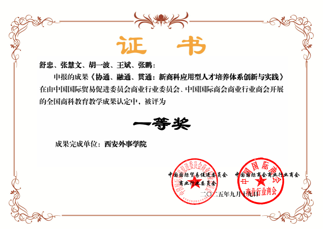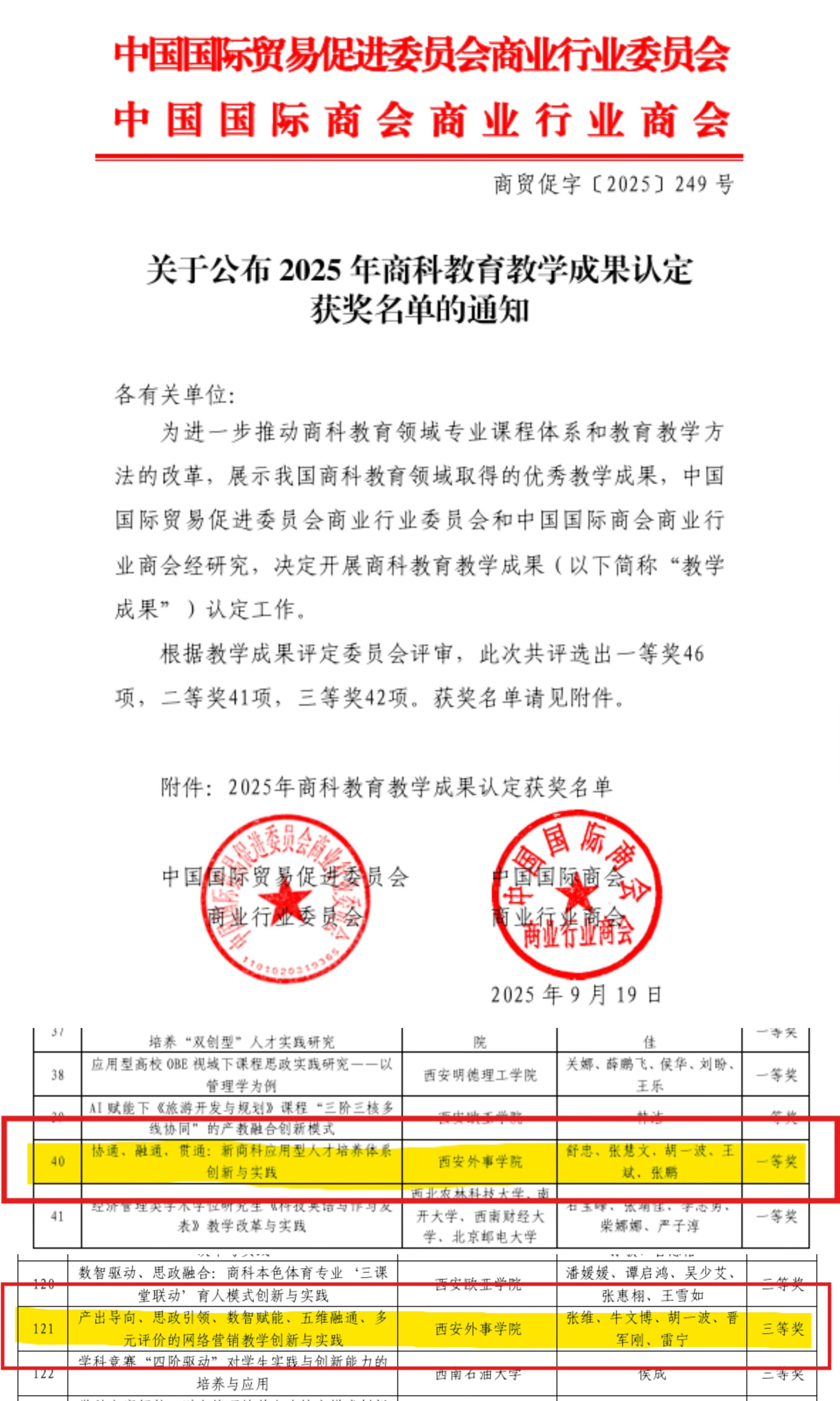 由院长舒忠教授领衔的教学团队所完成的商科教育领域专业改革成果《协通、融通、贯通:新商科应用型人才培养体系创新与实践》,荣获中国贸促会2025年商科教育教学成果一等奖,并同时获得校级教学成果二等奖。此外商学院电商系张维副教授领衔的团队所完成的成果《产出导向、思政引领、数智赋能、五维融通、多元评价的网络营销教学创新与实践》也荣获了中国贸促会2025年商科教育教学成果三等奖。该奖项旨在表彰在商科教育领域取得显著成效的优秀教学成果。此项荣誉,是商学院长期坚持以学生为中心、深化教学改革、创新人才培养模式的集中体现,标志着学院在商科教育教学质量与成效方面达到了一个新的高度,形成了可复制、可推广的先进经验。