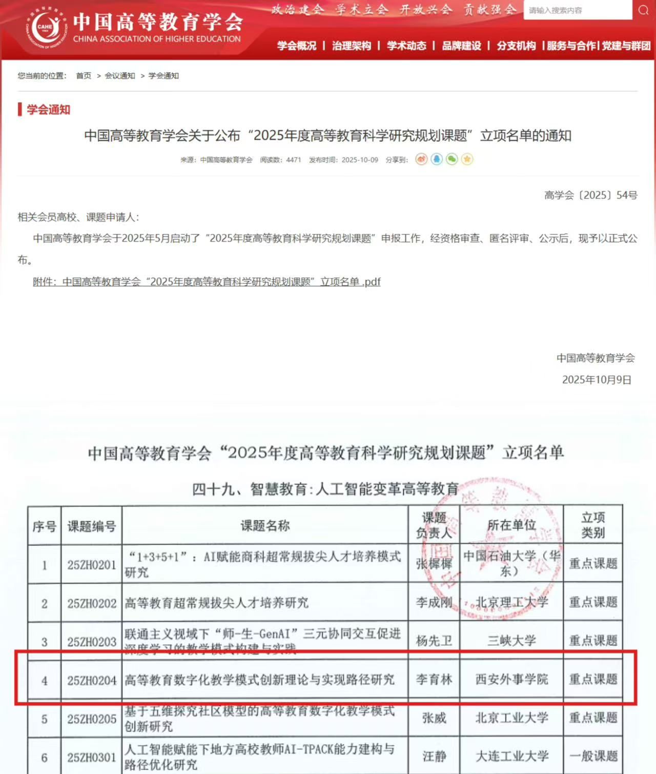 由副院长李育林教授领衔的科研团队申报的课题《高等教育数字化教学模式创新理论与实现路径研究》成功获批2025年度高等教育科学研究规划课题立项。该课题聚焦高等教育改革与发展中的前沿与关键问题,致力于探索应用型商科人才培养的新模式、新路径。此次立项,体现了学院对教育教学改革研究的高度重视,对推动学院教学理念创新与实践升级具有重要意义。