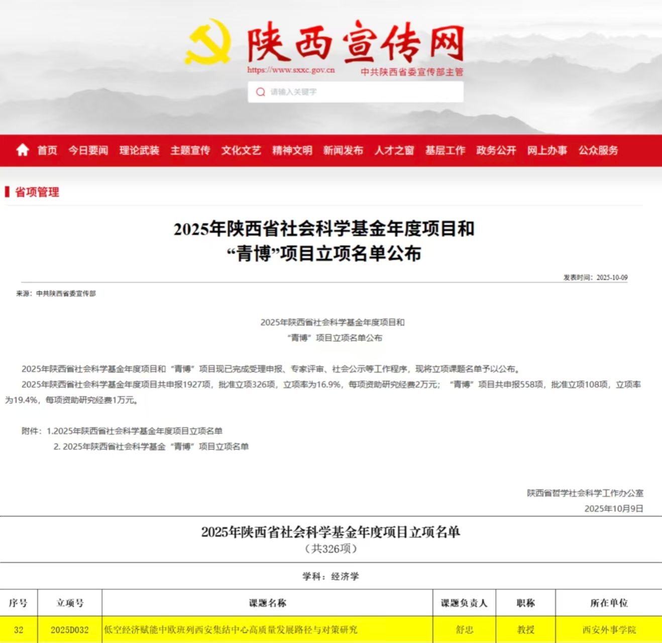 由院长舒忠教授领衔的科研团队申报的课题《低空经济赋能中欧班列西安集结中心高质量发展路径与对策研究》,经严格评审,成功获批2025年陕西省社会科学基金年度项目立项。值得一提的是,该课题为我校在本年度陕西省社科基金经济学科中“唯一入选”项目。陕西省社会科学基金项目是省内哲学社会科学研究领域层次高、权威性强的科研项目。此次立项,不仅是对舒忠教授及团队学术研究能力的充分肯定,也是对商学院在相关学科领域研究水平与创新潜力的高度认可,将为学院相关学科的纵深发展注入强劲的学术动力。