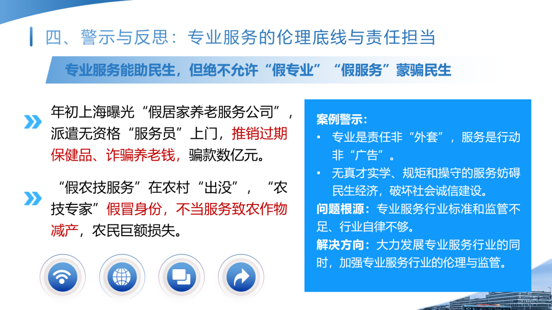 为加深同学们对专业服务与民生经济作用的印象,会议详细举例介绍部分产业及公司在专业服务与民生经济上的做法与部分反面案例,如:部分假企业公司因监管不足,自律不够导致农作物减产的重大错误。对此,陈郭禧特别强调:“专业是责任而不是‘外套’,服务是行动而不是‘广告’。”将会议重点引到如何具体把所学的专业知识投入实践