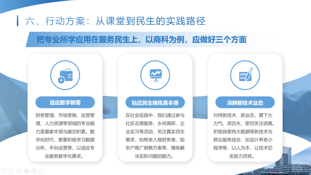 新时代青年需要锤炼专业本领,储备数据分析等技能,同时积极投身社会实践,在真实场景中锤炼解决民生问题的能力。此外,随着社会科技的不断发展,同学们需要将专业技能与科学技术相结合,人工智能技术与民生服务相结合。要多关注社会真实场景和民生,从真实场景中不断学习和吸取经验,真正做到内化于心,外化于行。
