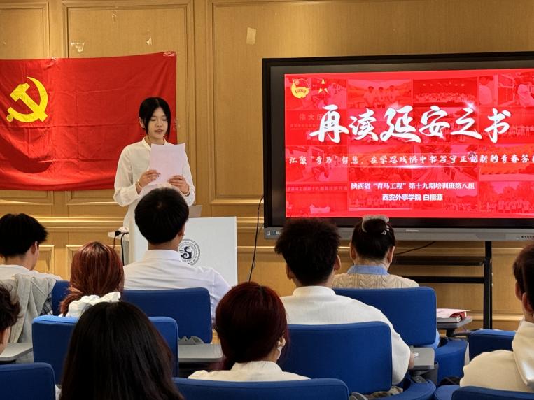 白栩源同学以《再读延安之书 汇聚青马智慧——在学思践悟中读懂守正创新的青春答卷》为题,结合自身在“青马工程”中的学习实践,围绕“学思践悟”四个维度,生动讲述了如何通过多元视角碰撞、跨学科协作、实地沉浸体验等方式,深刻理解延安精神的时代内涵与实践路径。